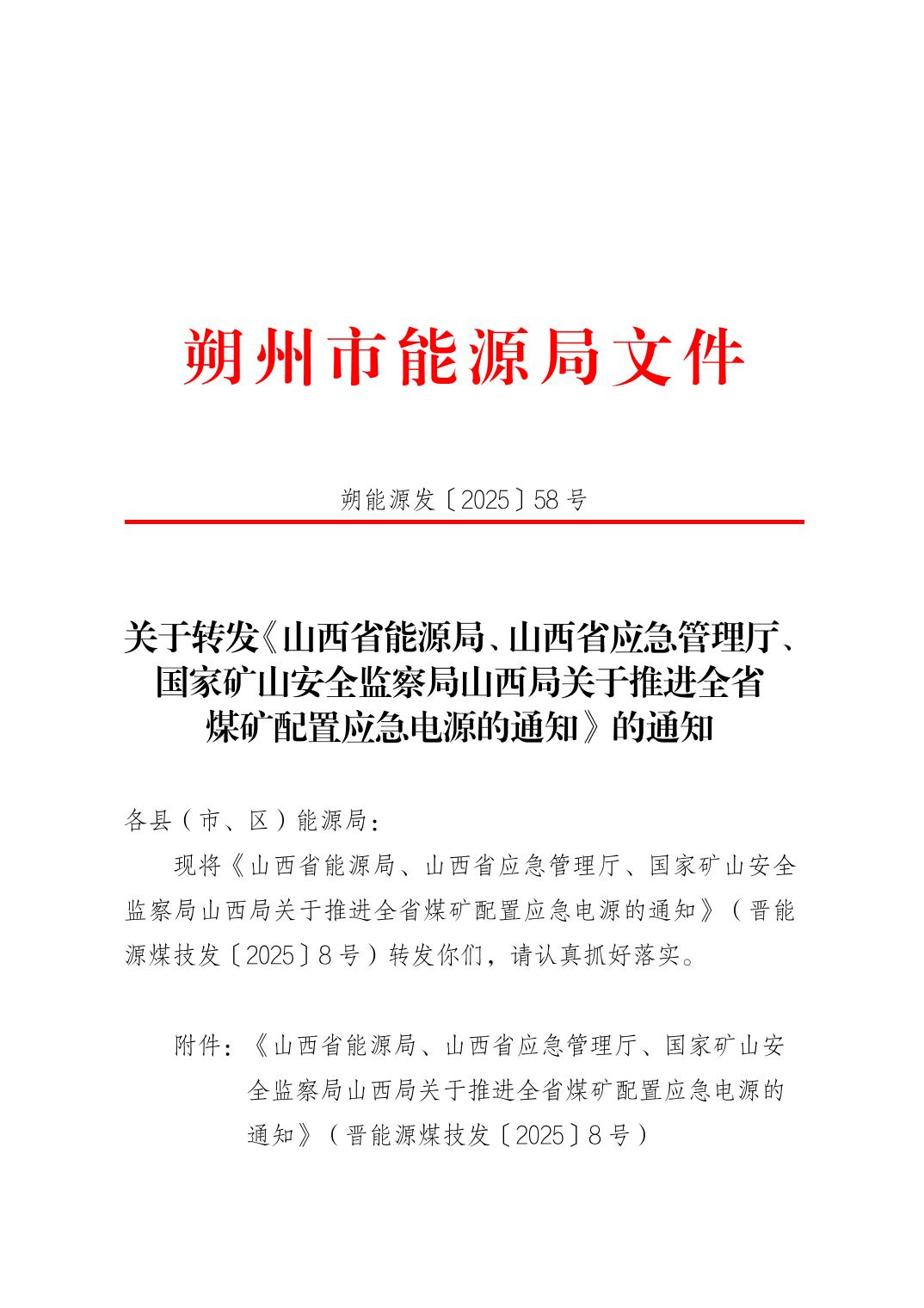 关于转发《山西省能源局、山西省应急管理厅、国家矿山安全监察局山西局关于推进全省煤矿配置应急电源的通知》的通知